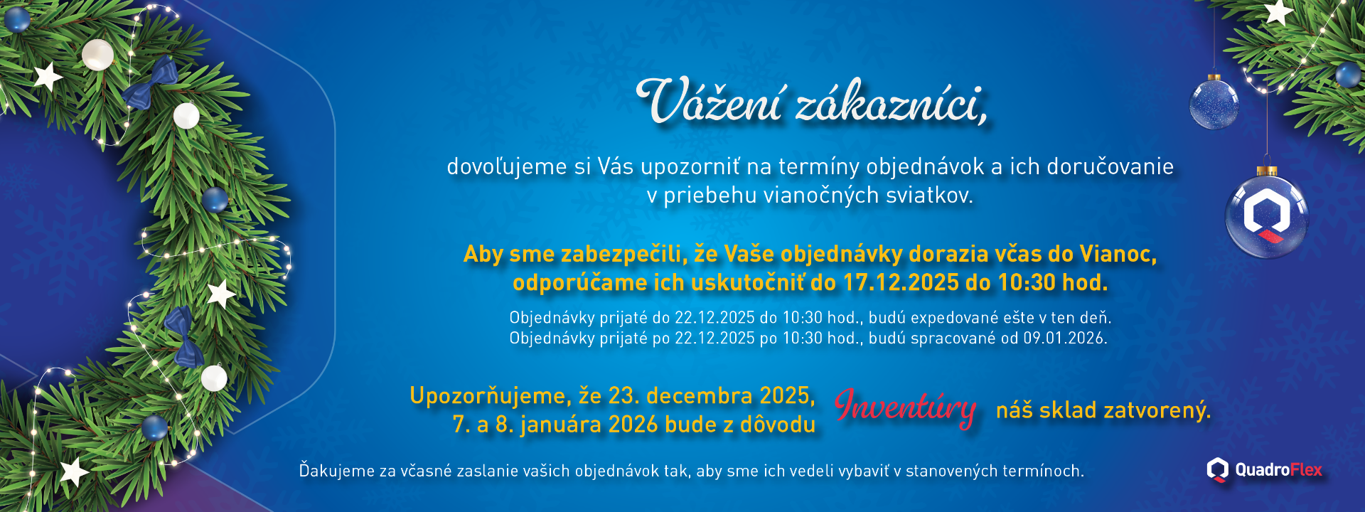 Dovoľujeme si Vás upozorniť na TERMÍNY OBJEDNÁVOK a ich doručovanie v priebehu Vianočných sviatkov.